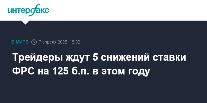 Москва. 7 апреля. INTERFAX.RU - Трейдеры пересматривают прогнозы относительно того, какими темпами Федеральная резервная система (ФРС) будет менять процентные ставки в этом году, и теперь ожидают пять понижений суммарно на 125 базисных пунктов (б.п.), сообщает агентство Bloomberg.