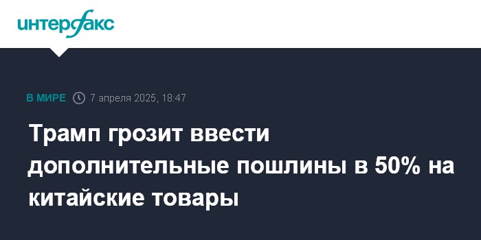 Москва. 7 апреля. INTERFAX.RU - Американская администрация введет дополнительные 50-процентные пошлины против Пекина, если китайская сторона не откажется от пошлин в 34% на американские товары, заявил в понедельник президент США Дональд Трамп.