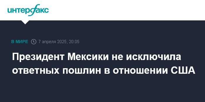 Москва. 7 апреля. INTERFAX.RU - Президент Мексики Клаудия Шейнбаум в понедельник заявила, что ответных мер в отношении США после введенных Вашингтоном пошлин исключать нельзя, но Мехико хотело бы избежать этого.