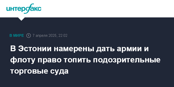 Москва. 7 апреля. INTERFAX.RU - Парламент Эстонии планирует наделить Силы обороны и ВМС правом применять военную силу к торговым судам, в отношении которых возникают подозрения в намерении повредить подводные кабели и иные инфраструктурные объекты.