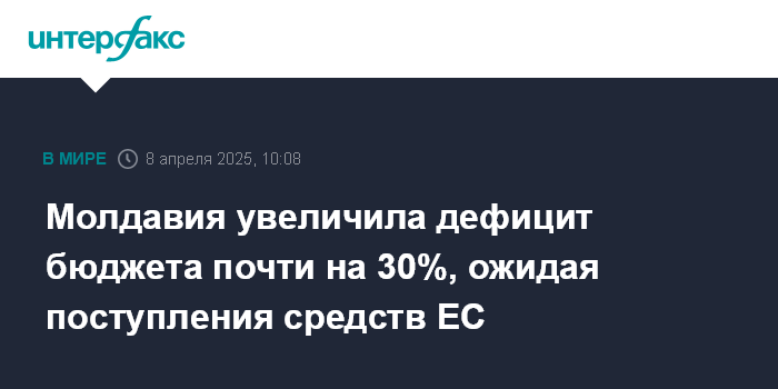 Москва. 8 апреля. INTERFAX.RU - Парламент Молдавии принял поправки в закон о госбюджете на 2025 год, которые предусматривают рост дефицита госбюджета страны на 28,9%, до 17 млрд 906,35 млн леев (5,1% ВВП), сообщила пресс-служба парламента.