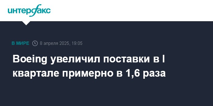 Москва. 8 апреля. INTERFAX.RU - Американская аэрокосмическая корпорация Boeing Co. увеличила поставки самолетов клиентам примерно в 1,6 раза в первом квартале по сравнению с сопоставимым периодом прошлого года.