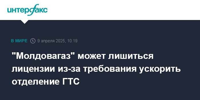 Москва. 9 апреля. INTERFAX.RU - Национальное агентство по регулированию в энергетике (НАРЭ) Молдавии предписало АО "Молдовагаз" (50% акций принадлежит "Газпрому") завершить процедуру выделения газотранспортных сетей (ГТС) в "Молдоватрансгаз" (дочерняя компания "Молдовагаз") до 31 июля 2025 года, что значительно раньше изначально запланированного срока (30 сентября 2026 года), сообщается в пресс-релизе НАРЭ.