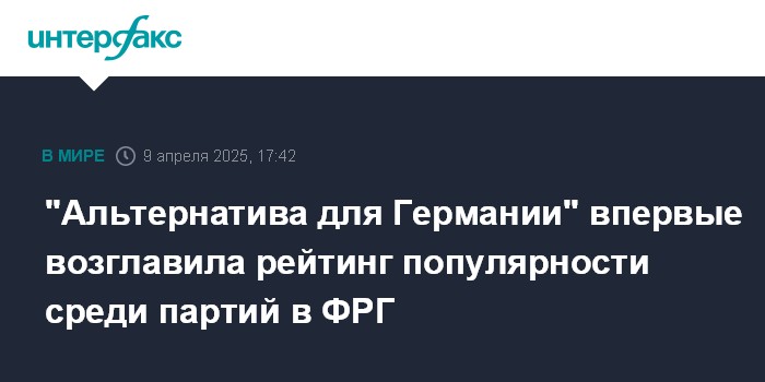 Москва. 9 апреля. INTERFAX.RU - Ультраправая партия "Альтернатива для Германии" (АдГ, AfD) впервые в своей истории возглавила рейтинг популярности политических сил в стране, сообщают европейские СМИ со ссылкой на опрос Ipsos, проведенный 4-5 апреля среди примерно тысячи человек.