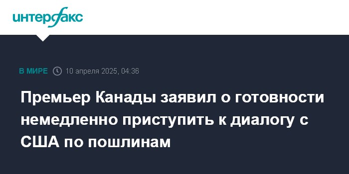 Москва. 10 апреля. INTERFAX.RU - Премьер-министр Канады Марк Карни заявил, что начнет торговые переговоры с президентом США Дональдом Трампом "немедленно".