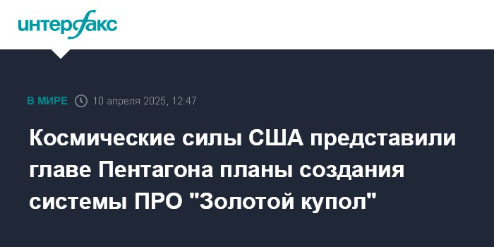 Москва. 10 апреля. INTERFAX.RU - Командование Космических сил США сообщило, что завершило разработку вариантов создания системы противоракетной обороны "Золотой купол" в рамках указания президента Дональда Трампа и направило свои рекомендации главе Пентагона Питу Хегсету для рассмотрения и одобрения.