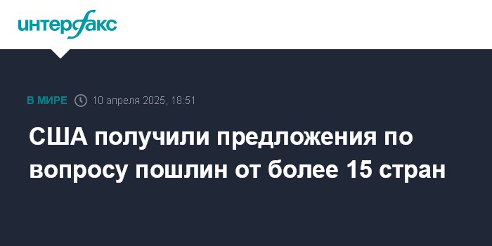Москва. 10 апреля. INTERFAX.RU - Свыше 15 государств направили предложения Вашингтону, нацеленные на то, чтобы избежать повышенных пошлин. Об этом сообщил в четверг директор Национального экономического совета США Кевин Хассетт.