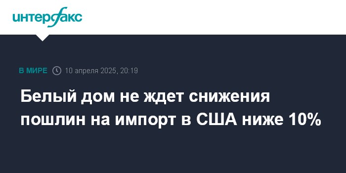 Москва. 10 апреля. INTERFAX.RU - Минимальный размер ответных пошлин, действующих в отношении более 75 стран, запросивших переговоры с США по тарифам, вряд ли опустится ниже 10%, сказал CNBC директор Национального экономического совета США Кевин Хассетт.