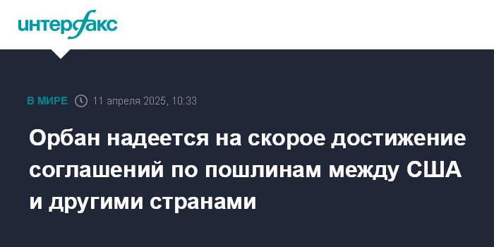 Москва. 11 апреля. INTERFAX.RU - Премьер-министр Венгрии Виктор Орбан считает, что президент США Дональд Трамп скоро заключит тарифные соглашения со странами по всему миру. Как сообщают западные СМИ, Орбан заявил это в эфире государственного радио.