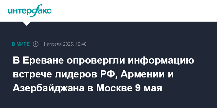 Ранее в Кремле сообщали, что 14 марта в телефонном разговоре с Путиным Пашинян подтвердил, что принимает приглашение президента России и будет участвовать в юбилейных торжествах 9 мая в Москве по случаю 80-летия Победы в Великой Отечественной войне.