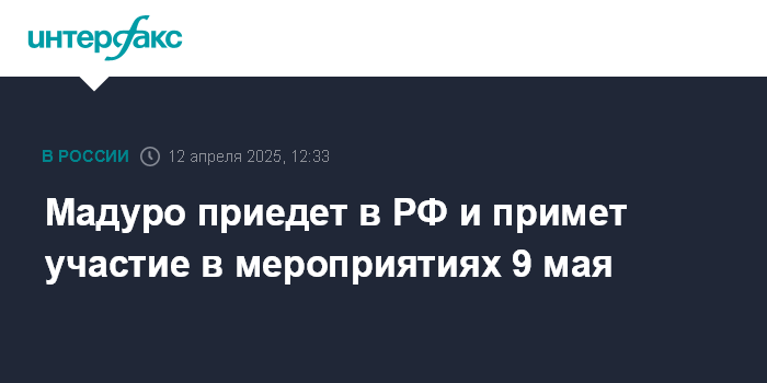 Москва. 12 апреля. INTERFAX.RU - Президент Венесуэлы Николас Мадуро посетит Россию в мае, примет участие в мероприятиях, посвященных 80-летию Победы в Великой Отечественной войне, сообщил в субботу глава МИД РФ Сергей Лавров.