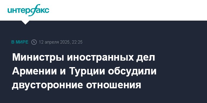 Москва. 12 апреля. INTERFAX.RU - Министры иностранных дел Армении и Турции Арарат Мирзоян и Хакан Фидан обсудили отношения двух стран, обменялись мнениями о региональных событиях, сообщает пресс-служба армянского внешнеполитического ведомства.