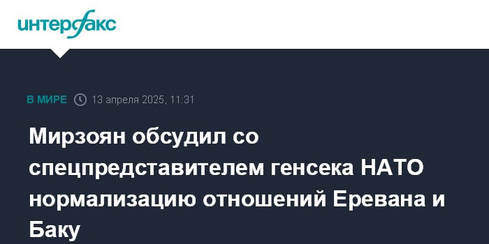 Москва. 13 апреля. INTERFAX.RU - Министр иностранных дел Армении Арарат Мирзоян обсудил нормализацию отношений с Азербайджаном со специальным представителем генсека НАТО по Южному Кавказу и Центральной Азии Хавьером Коломиной.