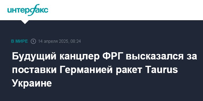 Москва. 14 апреля. INTERFAX.RU - Лидер победившего на немецких парламентских выборах блока ХДС/ХСС, кандидат на пост канцлера ФРГ Фридрих Мерц заявил, что Германии следует поставлять Украине ракеты большой дальности Taurus.
