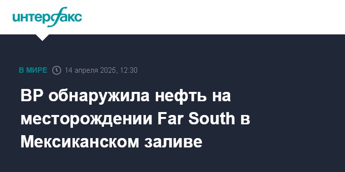 Москва. 14 апреля. INTERFAX.RU - BP Plc произвела успешное разведочное бурение на месторождении Far South в глубоководной части Мексиканского залива, разработкой которого она занимается совместно с американской Chevron Corp.