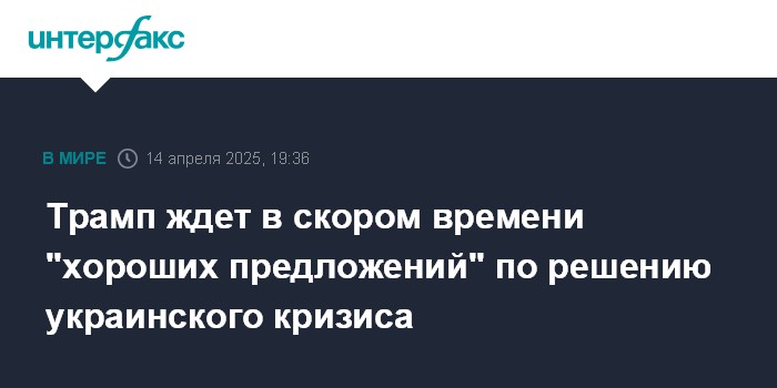 Москва. 14 апреля. INTERFAX.RU - Президент США Дональд Трамп в понедельник выразил надежду на скорое завершение украинского конфликта и ожидает предложений по решению этого вопроса.