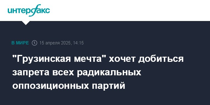Москва. 15 апреля. INTERFAX.RU - Правящая в Грузии партия "Грузинская мечта" намерена запретить до конца 2025 года все радикальные оппозиционные партии, лидеры которых совершили в прошлом преступные действия, посягающие на конституционный строй и призывающие к смене власти революционным путем.