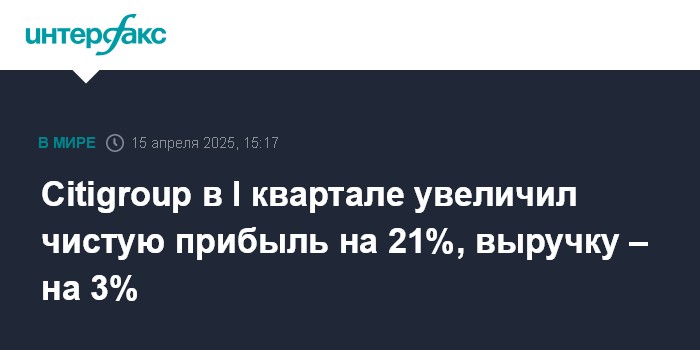 Москва. 15 апреля. INTERFAX.RU - Citigroup Inc., входящий в число крупнейших банков США, в первом квартале 2025 года увеличил чистую прибыль почти на 21%, выручку - на 3%.