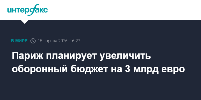 Москва. 15 апреля. INTERFAX.RU - Французский премьер Франсуа Байру считает необходимым выделить дополнительно 3 млрд евро на оборону, сообщает во вторник телеканал BFM TV.