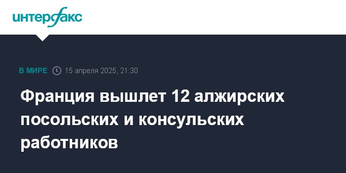Москва. 15 апреля. INTERFAX.RU - Франция объявила о симметричных мерах в связи с решением властей Алжира выслать 12 сотрудников французского посольства, возложив на алжирские власти ответственность за ухудшение двусторонних отношений.