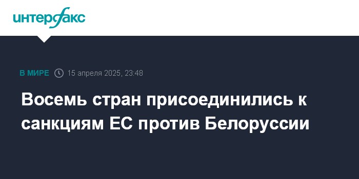 Москва. 15 апреля. INTERFAX.RU - Восемь европейских стран присоединились к санкциям Евросоюза в отношении Белоруссии, речь идет об ограничительных мерах, введенных решением Совета ЕС от 27 марта 2025 года.