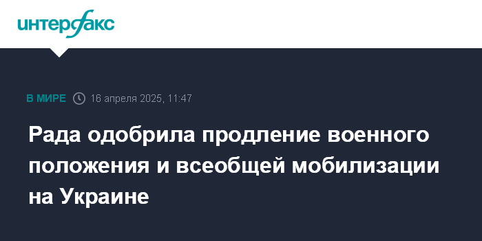 Москва. 16 апреля. INTERFAX.RU - Верховная рада Украины в среду продлила срок действия военного положения и всеобщей мобилизации, сообщили украинские СМИ со ссылкой на информацию народного депутата Ярослава Железняка в соцсетях.