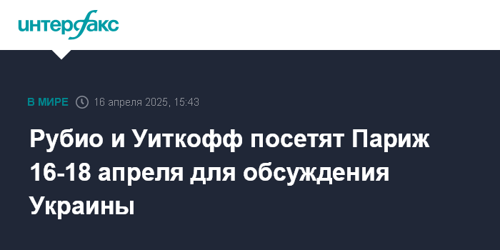 Москва. 16 апреля. INTERFAX.RU - Госсекретарь США Марко Рубио и спецпосланник президента США Стив Уиткофф посетят французскую столицу 16-18 апреля для обсуждения с европейскими коллегами путей завершения украинского конфликта, сообщает в среду госдеп.