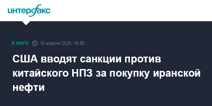 США вводят санкции против китайского НПЗ за покупку иранской нефти