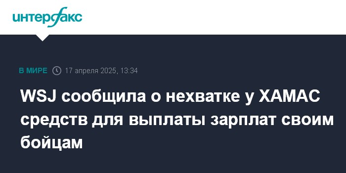 Москва. 17 апреля. INTERFAX.RU - Палестинское движение ХАМАС испытывает нехватку денежных средств и не может выплачивать зарплаты членам своего военизированного крыла в секторе Газа, сообщает издание The Wall Street Journal (WSJ) со ссылкой на источники.