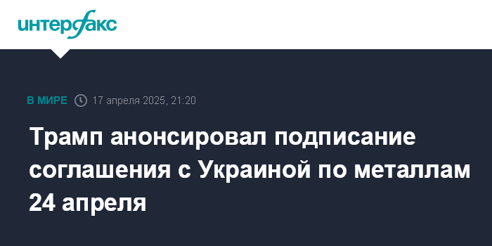 Москва. 17 апреля. INTERFAX.RU - Президент США Дональд Трамп заявил, что Вашингтон и Киев подпишут соглашение по редкоземельным металлам в следующий четверг, 24 апреля.
