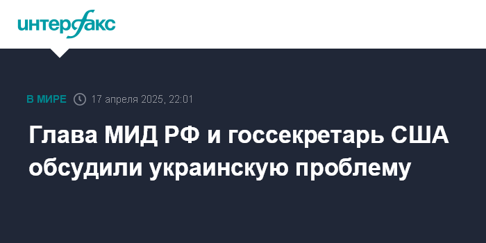 Москва. 17 апреля. INTERFAX.RU - 17 апреля состоялся телефонный разговор министра иностранных дел Российской Федерации Сергея Лаврова с госсекретарем США Марко Рубио, сообщил МИД РФ.