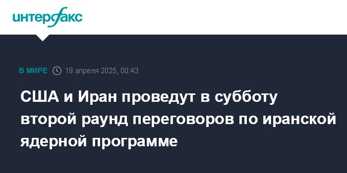 Москва. 19 апреля. INTERFAX.RU - Второй раунд опосредованных переговоров США и Ирана, посвященных проблеме иранской ядерной программы, пройдет в субботу в Риме.