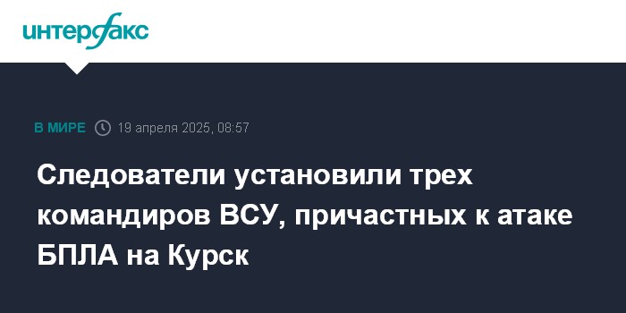 Москва. 19 апреля. INTERFAX.RU - Военные следователи установили имена украинских командиров, руководивших массированной атакой беспилотников на Курск в ночь на 15 апреля, сообщила официальный представитель СК России Светлана Петренко в субботу.