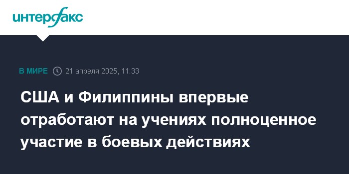 Москва. 21 апреля. INTERFAX.RU - Войска США и Филиппин на начавшихся 21 апреля учениях Balikatan впервые будут тренироваться вести полноценные боевые действия на случай возникновения вооруженного конфликта в регионе, сообщает Financial Times.