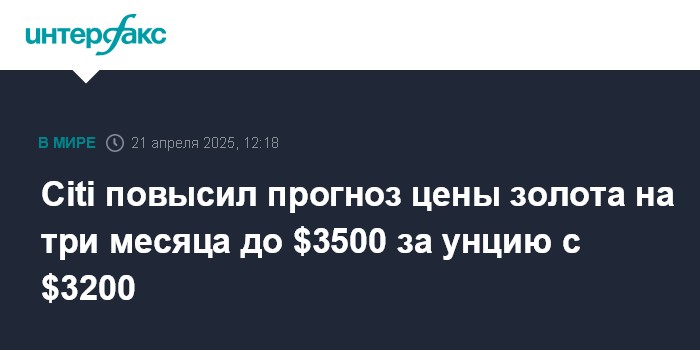 Москва. 21 апреля. INTERFAX.RU - Аналитики Citi Research повысили прогнозную цену золота на ближайшие три месяца до $3500 за унцию с ожидавшихся ранее $3200 за унцию.