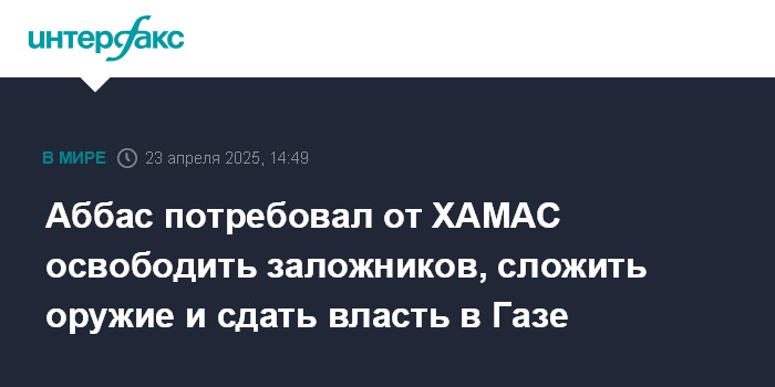 Москва. 23 апреля. INTERFAX.RU - Председатель Палестинской национальной администрации (ПНА) Махмуд Аббас в телеобращении c энергичными формулировками призвал движение ХАМАС освободить заложников, отойти от власти в секторе Газа и сложить оружие. Об этом пишет Jerusalem Post.