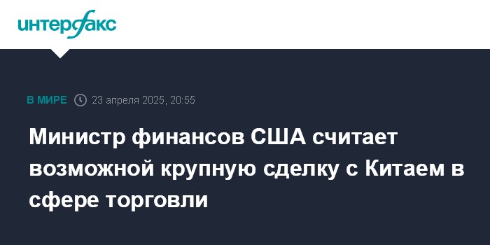 Москва. 23 апреля. INTERFAX.RU - У США есть возможность заключить масштабное соглашение с Китаем в сфере торговли, заявил в среду американский министр финансов Скотт Бессент.