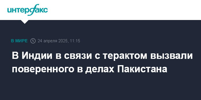 Москва. 24 апреля. INTERFAX.RU - В МИД Индии вызвали поверенного в делах Пакистана в Индии Саада Варраича в связи с терактом в Джамму и Кашмире на севере Индии, сообщают в четверг индийские СМИ.