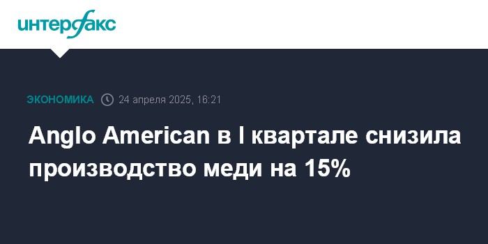 Москва. 24 апреля. INTERFAX.RU - Anglo American в первом квартале 2025 года снизила выпуск меди на 15%, до 169 тысяч тонн, сообщила компания.