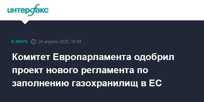 Москва. 24 апреля. INTERFAX.RU - Комитет Европарламента (ЕП) по промышленности, исследованиям и энергетике поддержал предложение Еврокомиссии о продлении нынешней схемы хранения газа в ЕС до 31 декабря 2027 года и согласовал снижение целевого показателя заполнения хранилищ на зиму до 83% от емкости.