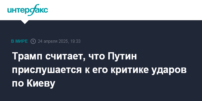 Москва. 24 апреля. INTERFAX.RU - Президент США Дональд Трамп верит, что президент России Владимир Путин прислушается к высказанной критике по поводу недавних ударов по Киеву.