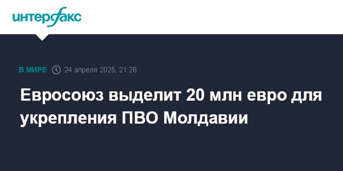 Москва. 24 апреля. INTERFAX.RU - Совет ЕС объявил о выделении за счет Европейского фонда мира помощи вооруженным силам Молдавии для модернизации возможностей ПВО страны в размере 20 млн евро.