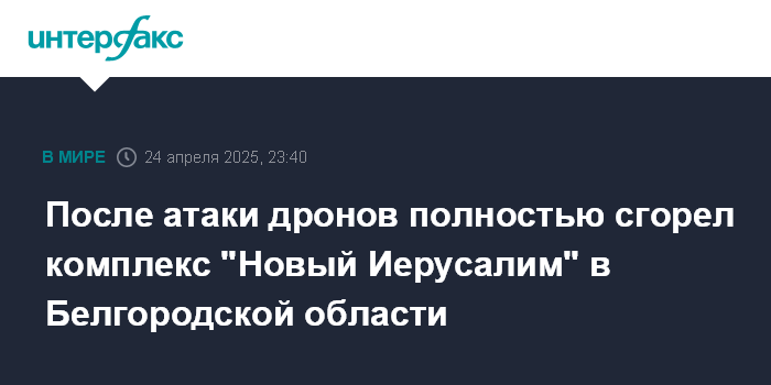 Москва. 24 апреля. INTERFAX.RU - В результате атаки беспилотников полностью сгорел храмовый комплекс "Новый Иерусалим" в Белгородской области, сообщил губернатор региона Вячеслав Гладков.