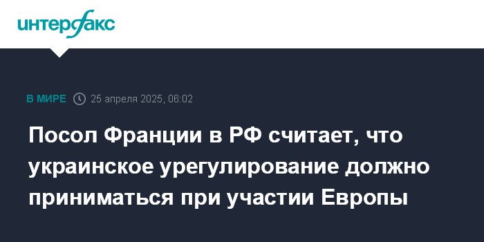 Москва. 25 апреля. INTERFAX.RU - Любое решение по мирному процессу на Украине должно приниматься при непосредственном участии Европы, поскольку это напрямую затрагивает безопасность всего европейского континента, заявил посол Франции в РФ Николя де Ривьер.