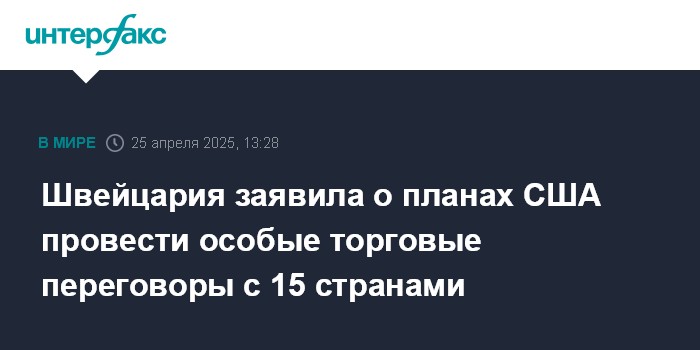Москва. 25 апреля. INTERFAX.RU - США выбрали Швейцарию и еще 14 государств для ведения торговых переговоров в привилегированном формате, заявила в пятницу швейцарский президент Карин Келлер-Зуттер.