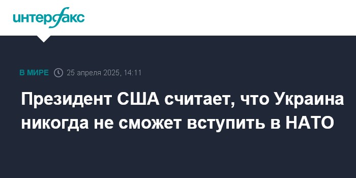 Москва. 25 апреля. INTERFAX.RU - Президент США Дональд Трамп заявил в интервью журналу Time, что у Украины нет шансов на вступление в НАТО, добавив, что вопрос с перспективами членства Украины в альянсе стал причиной конфликта.