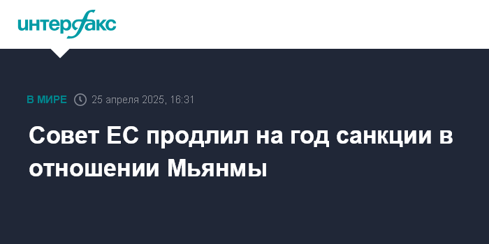 Москва. 25 апреля. INTERFAX.RU - Совет ЕС объявил в пятницу о продлении на год, до 30 апреля 2026 года, ограничительных мер в отношении физических и юридических лиц из Мьянмы "в связи с ситуацией в стране".