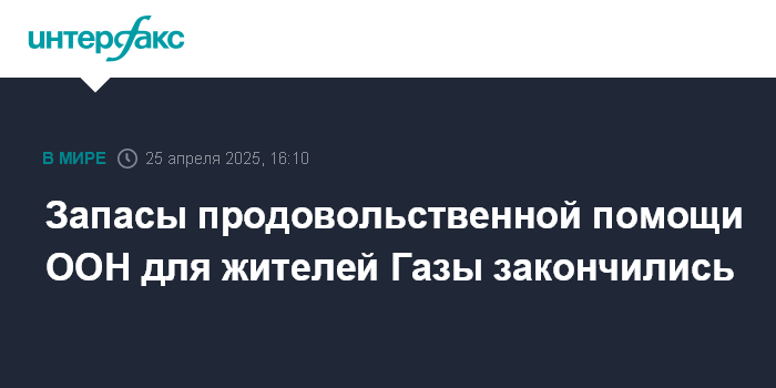Москва. 25 апреля. INTERFAX.RU - Всемирная продовольственная программа ООН (ВПП ООН) объявила в пятницу, что все запасы продовольствия для жителей сектора Газа исчерпаны.