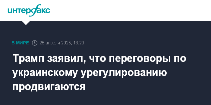 Москва. 25 апреля. INTERFAX.RU - Переговоры по украинскому урегулированию продвигаются, заявил в пятницу президент США Дональд Трамп, слова которого приводят американские СМИ.