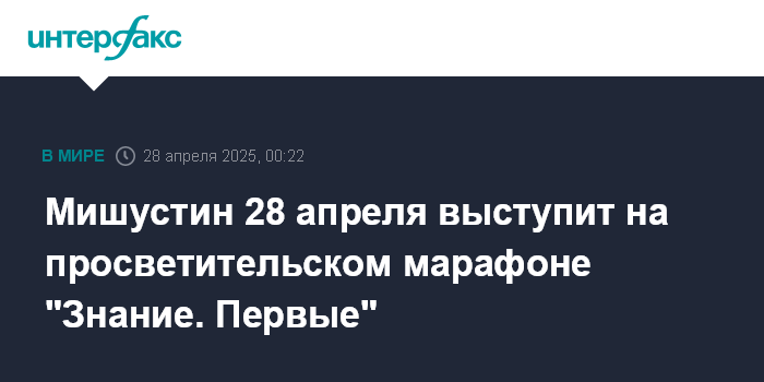 Москва. 28 апреля. INTERFAX.RU - Премьер-министр России Михаил Мишустин в понедельник примет участие в федеральном просветительском марафоне "Знание. Первые", сообщает пресс-служба правительства РФ.